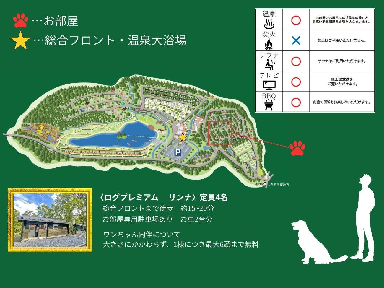 定員:4名、広さ:約67平米 ドッグラン約90~254平米 高さ:約130cm プライベートサウナ付 リビング+ダイニング+洋室+キッチン+ランドリー+客室温泉+ウッドデッキ ※3名~4名利用は、エアベット・ソファベットのお手配となります。 ================================ 【ワンちゃんのご宿泊について】 ●最大頭数:サイズ問わず6頭まで ●施設利用料:無料 ================================