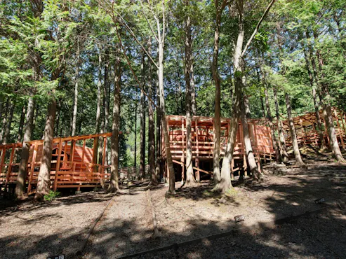 5万平方の森リゾートでオートキャンプを満喫できる宿泊施設。芝生エリアや、森林エリア、川などの自然がたっぷり。大型テントから食器までレンタルアイテムが充実しているので、気軽にキャンプが楽しめます。