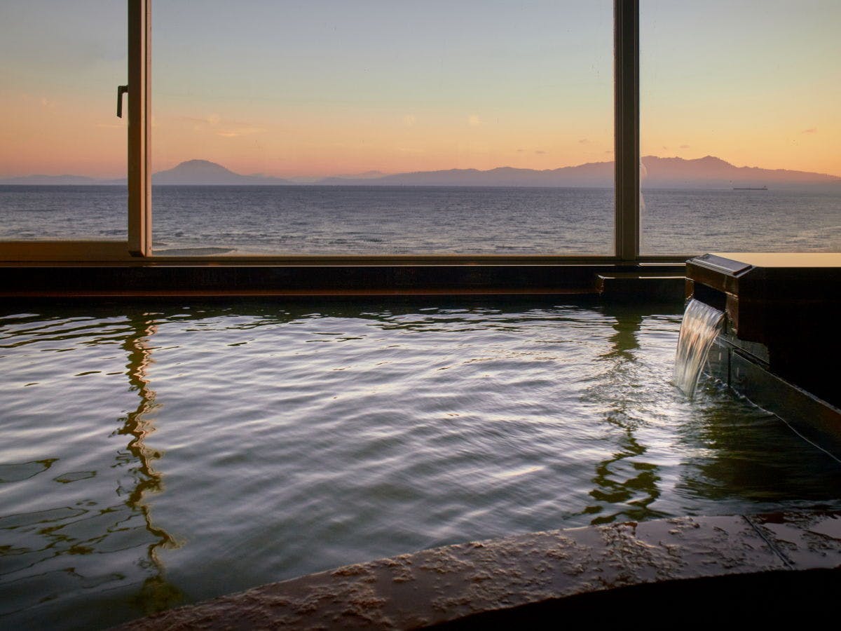 眼前に錦江湾を望む宿で、美肌成分が豊富な温泉に浸かる