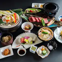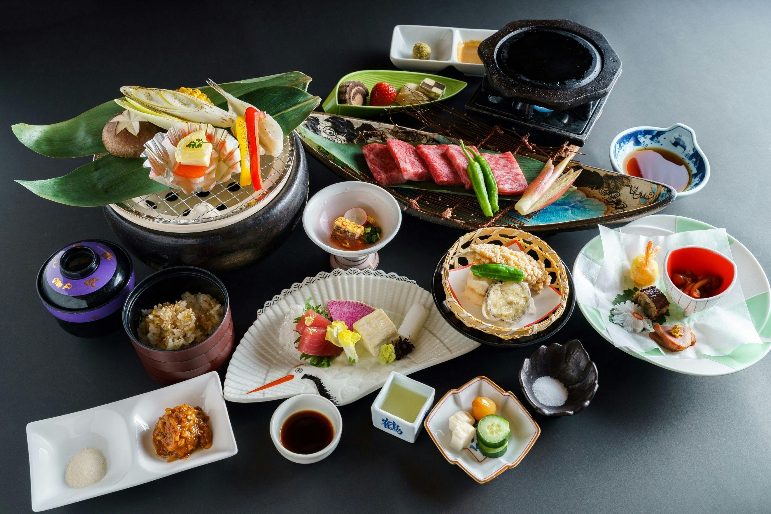 日光の炭で日光のおいしい物ばっかり集めて焼いた、鶴亀大吉の炭火会席。 山の幸や海の幸を炭火で焼いて召し上がっていただく炭火会席は、お泊りのお客様全員にお出しする当館の名物料理です。鶴亀大吉ならではのめでたい演出をお楽しみください。