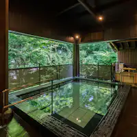 ・営業時間: 15:00~24:00 ・温泉: あり ・かけ流し: なし ・にごり湯: なし ・補足事項: (加温、加水) ◆特色:檜の香りが芳しい庭園風呂はその名の通り、当館自慢の庭園を愛でながら湯あみができる温泉です。 ◆付帯設備:トイレ ◆浴室小物:シャンプー、リンス、ボディソープ、石けん、化粧品類、ドライヤー