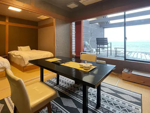 真正面に広がる海を観ながら、日頃のストレスを全て洗い流す事が出来ました。大好物の竹崎がにをたらふく食べて太良を満喫する事が出来ました(笑)朝のコーヒーも美味しく頂きました。ありがとう御座いました。出来ればアメニティを充実して頂ければ有り難かったかな??タオル類がもう少し欲しかったです。