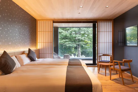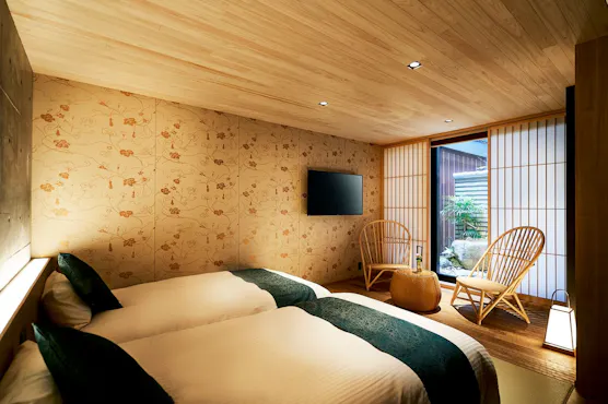 客室は四季を彩った和モダンな空間で、京都で住むように泊まる滞在を