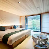 京町屋の東本願寺別邸渉成園(通称:枳殻邸)隠れ宿として、 京都の趣や風情をお楽しみいただけます。 現代様式に合った快適な空間で非日常な滞在が 「旅から佇む」に変わるひとときをお届けいたします。 趣向を凝らした客室では京唐紙により、 四季を彩った和モダンの空間を創り上げております。 外周部に面した部屋は、大開口の窓を設け、 東は枳殻邸の境内を、西は本願寺(京都タワー)を望み、 京唐紙の植物をモチーフに季節を表現しております。 四季折々の風景と共に「ゆっくりと、京都で住まうように泊まる」 そんな贅沢で優雅な時間を是非ともご堪能下さいませ。
