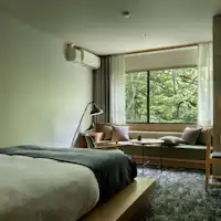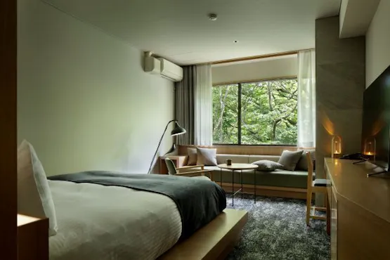 那須高原の森をイメージした洗練されたデザインの客室。 開放的な窓から見える森の景色を眺めながらリラックスして頂ける空間です。