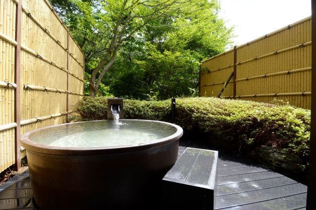 1000年以上の歴史を誇る、那須温泉源泉掛け流しの良質温泉。目の前に広がる緑豊かなプライベートフォレストの風景を感じながら入る露天風呂。各部屋ごとの貸切利用で、上質なお湯をお楽しみください。