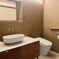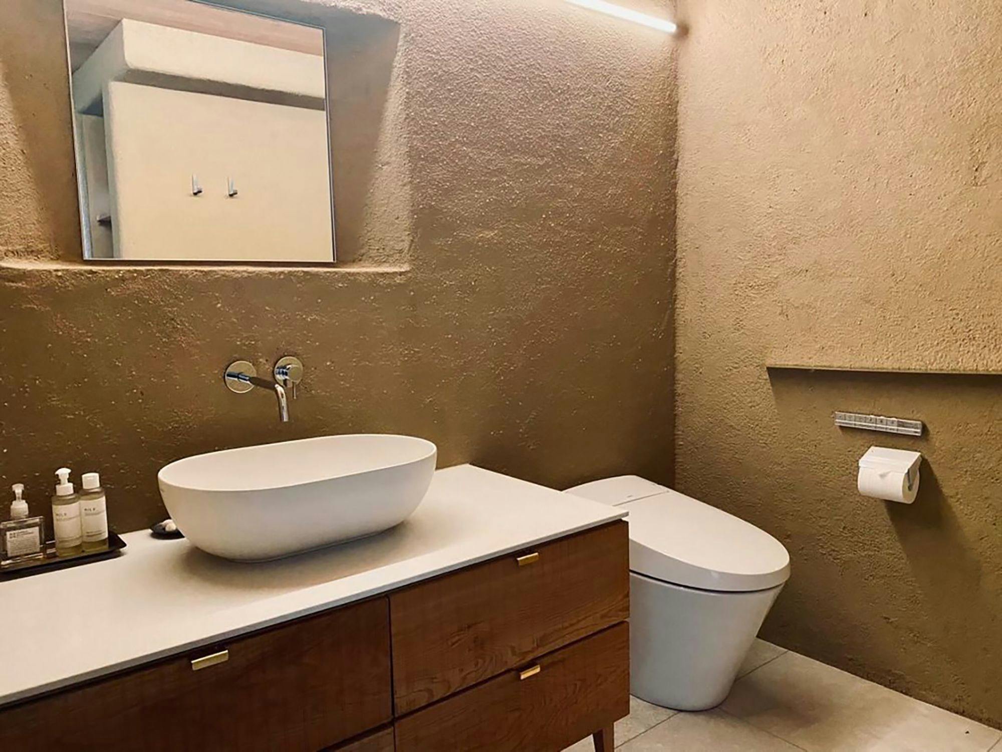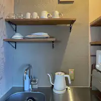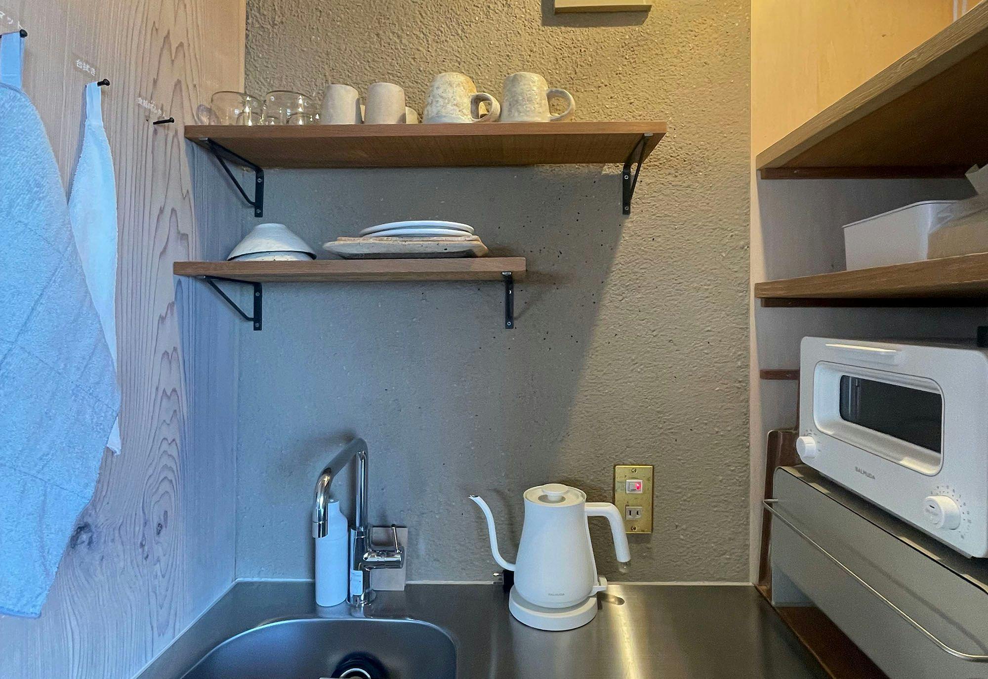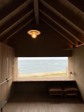 刻々と変わっていく空と海の表情を眺めて過ごしたり 洞穴にもぐりこみ静かに波の音に耳を傾けたり ゆったりとした時間と非日常ではない この町の日常を味わう場所 コンパクトなサニタリーとクローゼット、洞穴を思わせる土壁と低い天井のベッドルーム、反対側のドアはデッキへと繋がり、日本海を感じながらお過ごし頂けます。 海側のカウンターテーブルとゆったりとしたソファをご用意。上階には寝転がって過ごせる畳の間、どこにいても海を感じながら過ごしていただけます。昼は景色を眺め、夜は大窓のスクリーンを下しプロジェクターとしてお楽しみ頂けます。