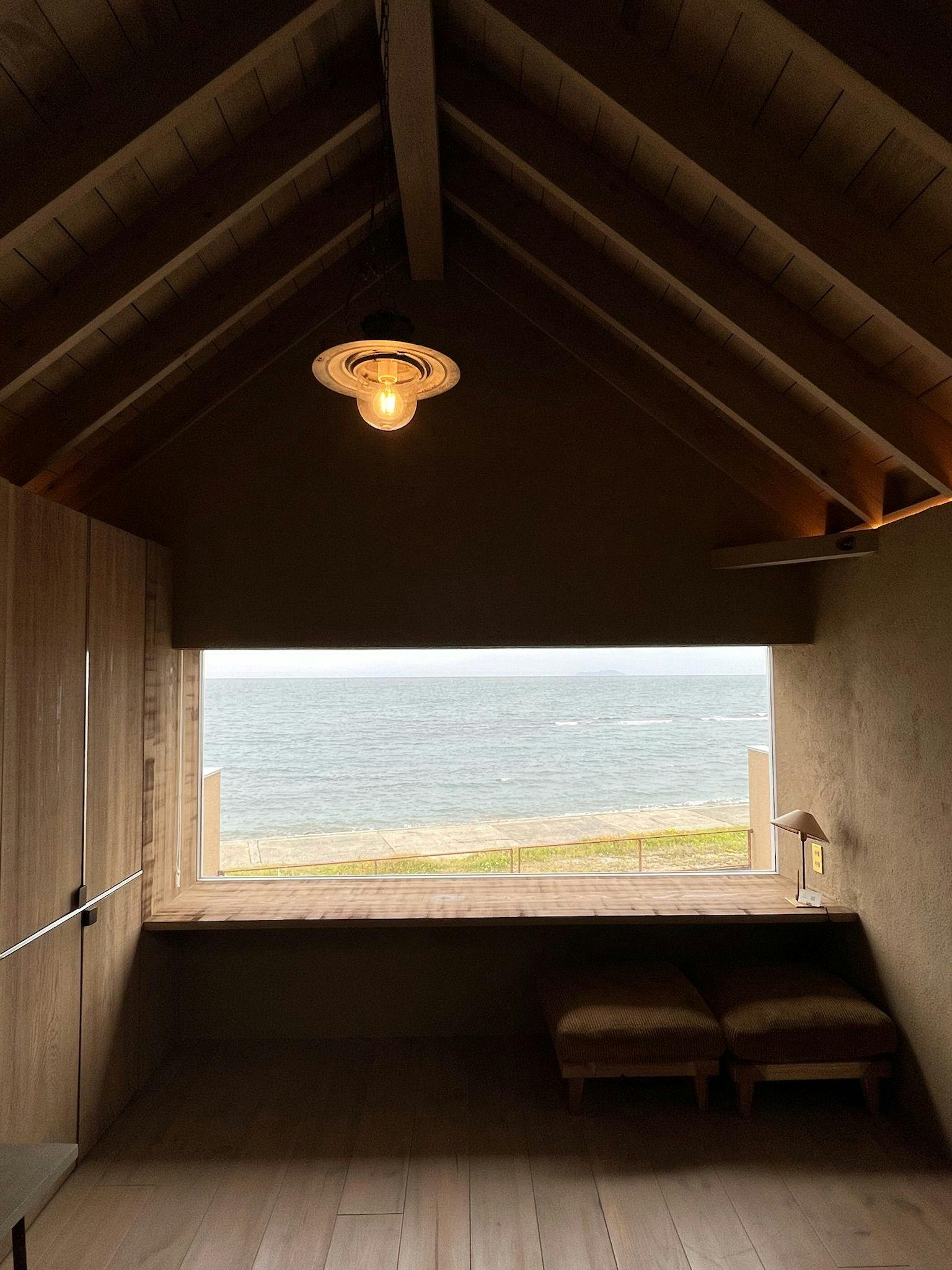 土壁の質感と差し込む光が柔らかな空間を作り出す大きな窓から、刻々と変わっていく空と海の表情を眺めて過ごしたり、洞穴にもぐりこみ静かに波の音に耳を傾けたり。ゆったりとした時間と非日常ではない この町の日常を味わう場所。