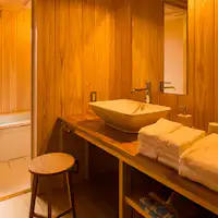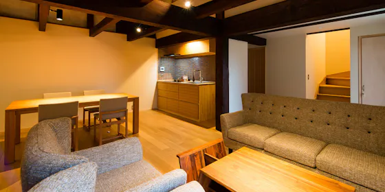 趣のある吹き抜けリビングに、落ち着きのある和室。その横には浴室があり、窓からは坪庭が見えます。ゆったりと湯船につかり庭を眺めるのは至福のひととき。2階のベッドルームからは、もう一つの坪庭も鑑賞できます。家族連れやグループほか、2名様のご利用でもゆっくりとおくつろぎいただけます。