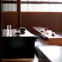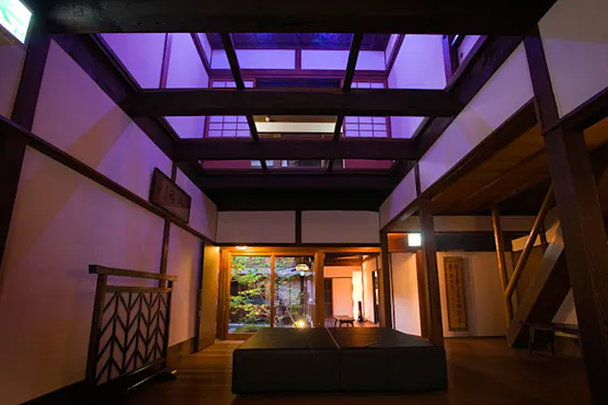 築100年の佇まいを生かし、「引き算」で再発見される価値。床を透明のアクリル床に、更にその上部は天井を抜いて古い屋根の架構を見せ、日本家屋が持つ水平方向の視点に、垂直方向の視座が生み出されました。 同時に、新たな断面は、可動式のスクリーンと照明を利用したインスタレーションとなります。客室座敷が七色の行燈と化すことで、建物全体が幻想的な雰囲気に包まれます。