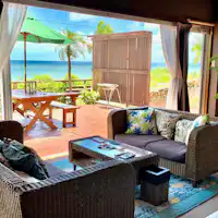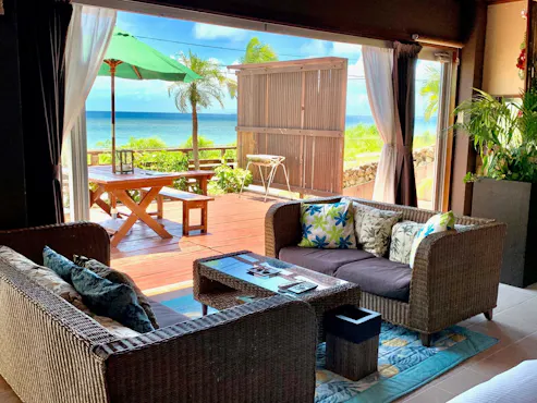波の音で目覚める程の距離に建つ1日1組だけのコンドミニアム。お部屋とテラスはキッチン完備で広々80㎡/IHキッチンも、もちろんオーシャンビューです。/朝カフェやBBQで、素敵な時間をお過ごし下さい/ヤシの葉が揺れる広いデッキ。駐車場もデッキの前に2台分あります。