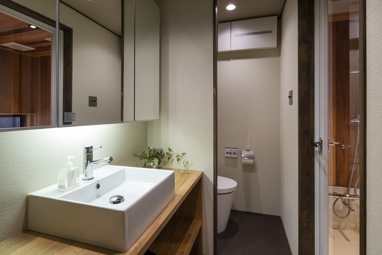 京町家の伝統を守りながら、現代の利便性を取り入れリノベーション。キッチン、浴室などの水回りはすべて使いやすく現代的に一新されています。キッチンには調理器具や食器類も揃っているので、徒歩圏内の「錦市場」で食材を買い、自炊をすることも可能です。