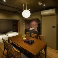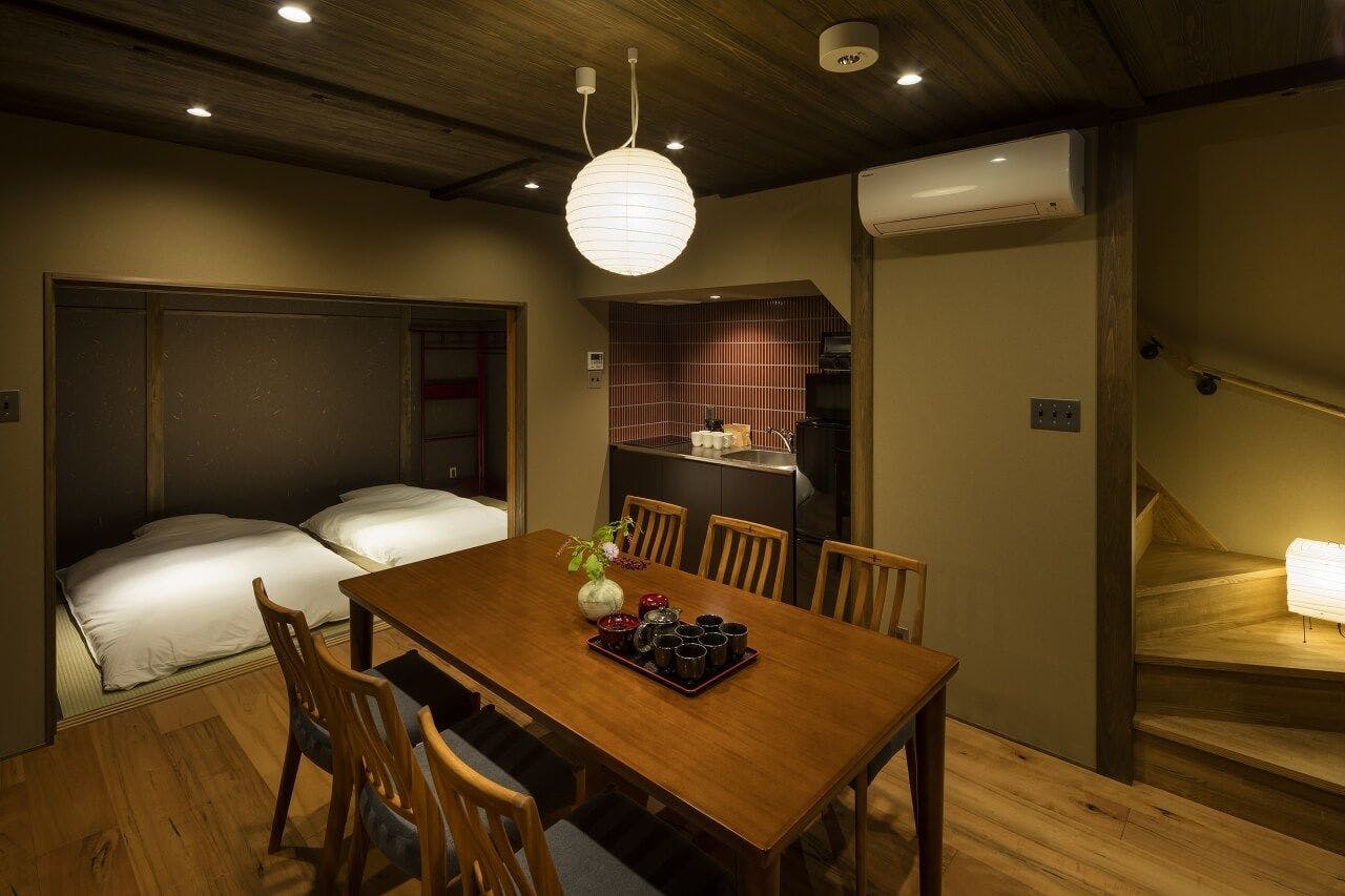 「建仁寺」の近くの京町家(京町屋)をリノベーションした1日1組限定、一棟貸しの宿泊施設。リビング・ダイニング、洋寝室、和室2室、自炊できるキッチン、トイレ・洗面台を2ヶ所備え、カップルでもグループでもゆったりとご滞在いただけます。さまざまな日本のアートが散りばめられた町家宿で、贅沢なひとときをお楽しみください。