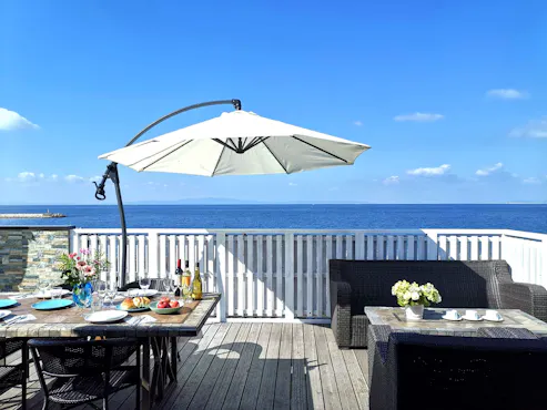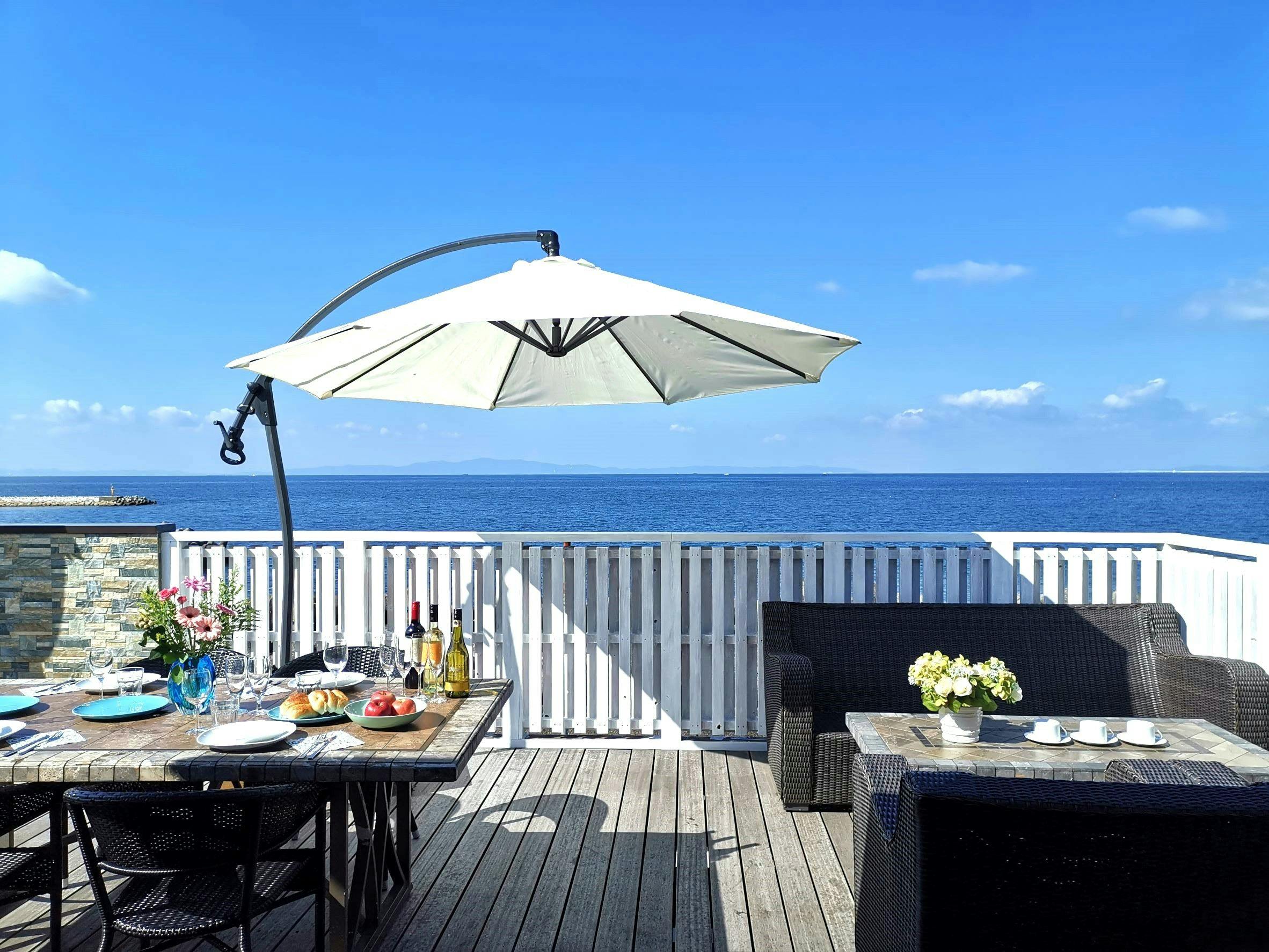 関空から車で25分の空港近くにある海を一望できる大きなバルコニー付き2階建ての豪華な貸し別荘です。 リビングから繋がるバルコニーに出ると、真っ青な海が目の前に広がります。日暮れ時には関空から離発着する飛行機が夕日に映る美しい景色をご覧頂けます。夜は波の音を聞きながら真っ黒な海に浮かぶ美しい関西空港の夜景や星空をお楽しみいただけます。