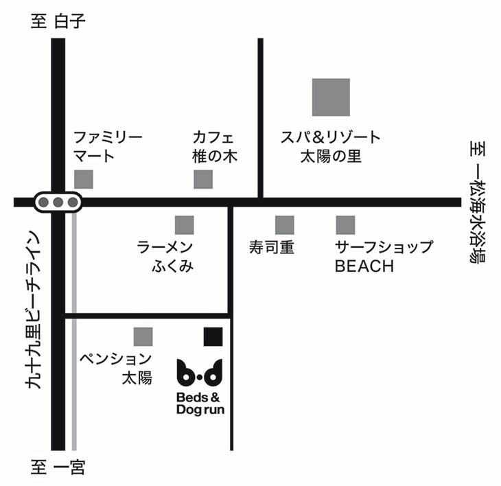 当施設は一松海水浴場方向に向かって見た際、左手に「カフェ椎の木」様があり、その反対側にある道を入って3軒目に位置しております。ナビには「カフェ椎の木」様の住所を入力してお越しいただくか、Google mapで「Beds and Dog run」で検索してお越しいただけるようお願いいたします。「カフェ椎の木」様の住所は、千葉県長生郡長生村驚12-580となります。
