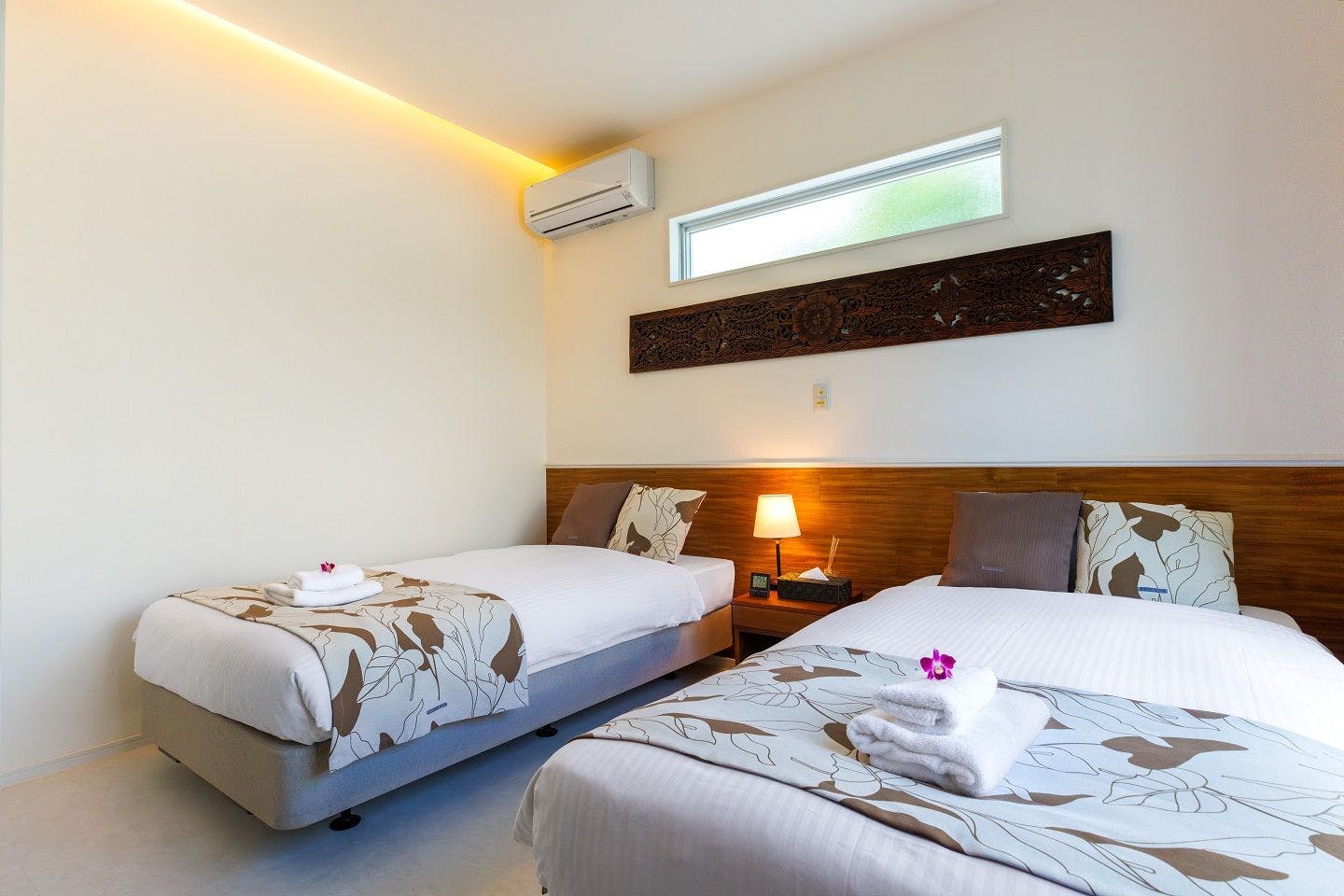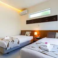 8名様まで同一料金! 海まで10秒、プール付き新築ヴィラ「コルディオ・マリーナ金武」 和室、2つのベッドルームにはセミダブル4台をご用意。 完全プライベート空間でゆっくりとした時間をお過ごしください。