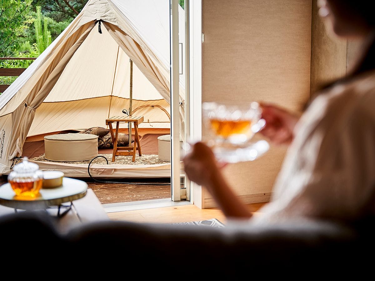 高原の自然に囲まれた客室で、誰にも気兼ねせず温泉に浸かり、深呼吸する。