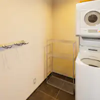 ウッドフロアのリビングルームにはソファ、壁掛け式薄型テレビとDVDプレーヤー、キッチンにはコンロ、オーブン、冷蔵庫、ダイニングエリアが付いています。わがやにはベッドが備わるベッドルーム2室とロフトがあり、すべてにウッドフロアのミニマルな内装が施されています。
