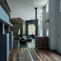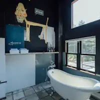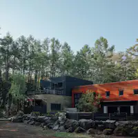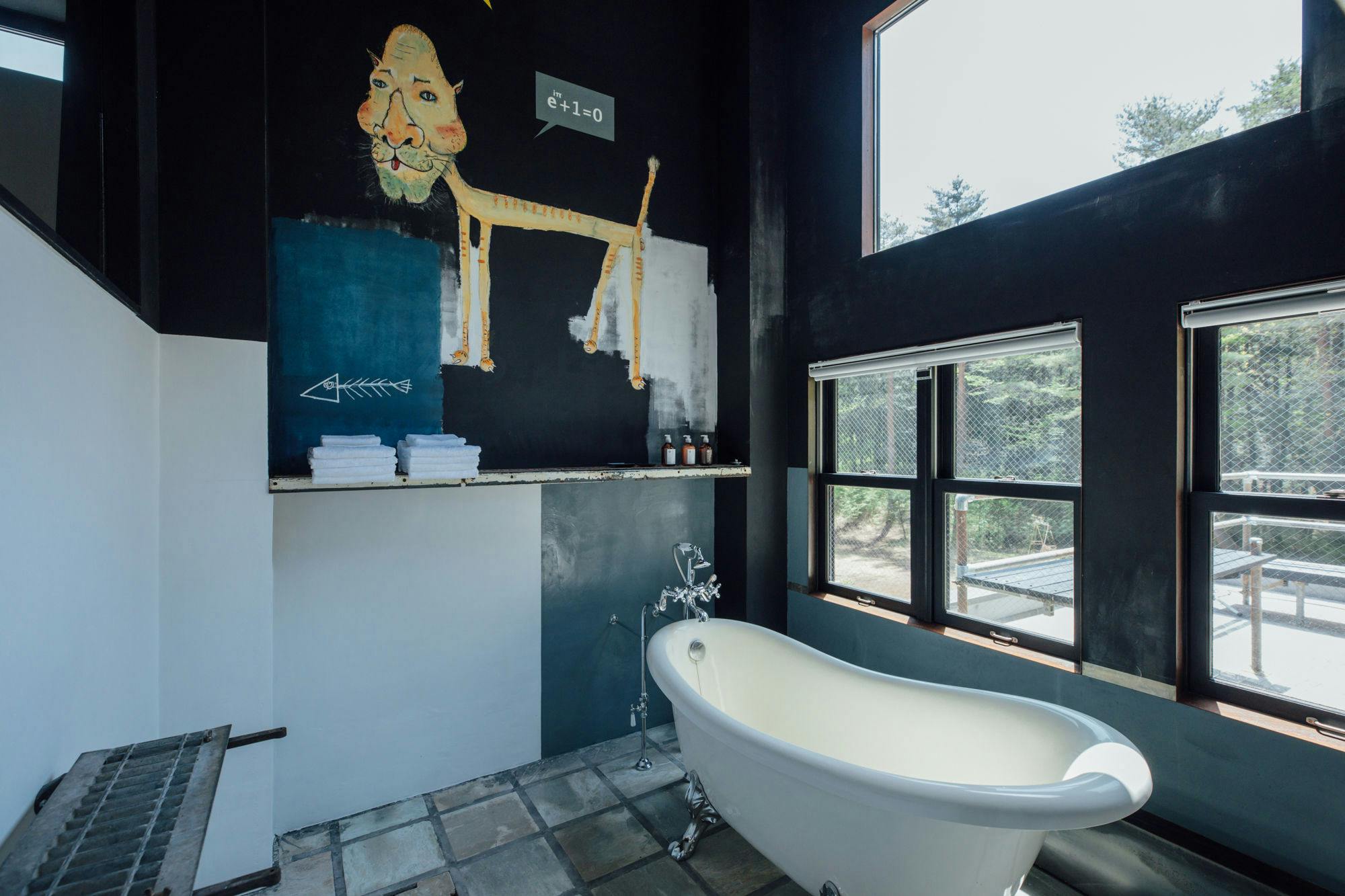 標高1000m。ありのままの、荒削りで、素朴であって独特な森の中。 太陽の傾き、気候の揺らぎ、季節の移り。 深呼吸をすると全身の隅々まで行き渡る、空気の感覚。 有機的な森に、錆びた壁の無機質な建物。 高低差をあやつりエッジの効いた空間。元は撮影スタジオ。 あるものを残しながら、削ぎ落とし、磨きあげて生まれたHOTEL。