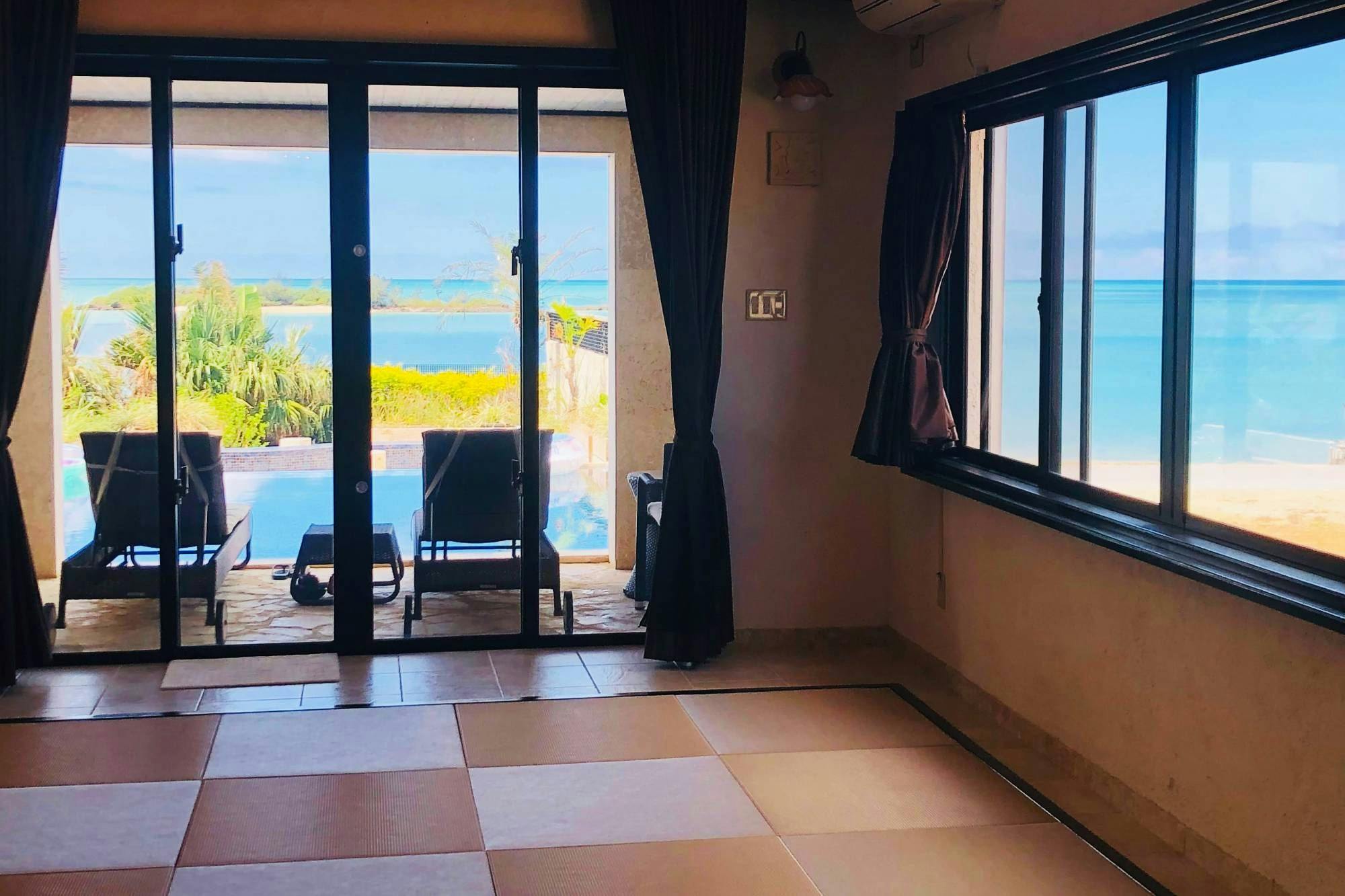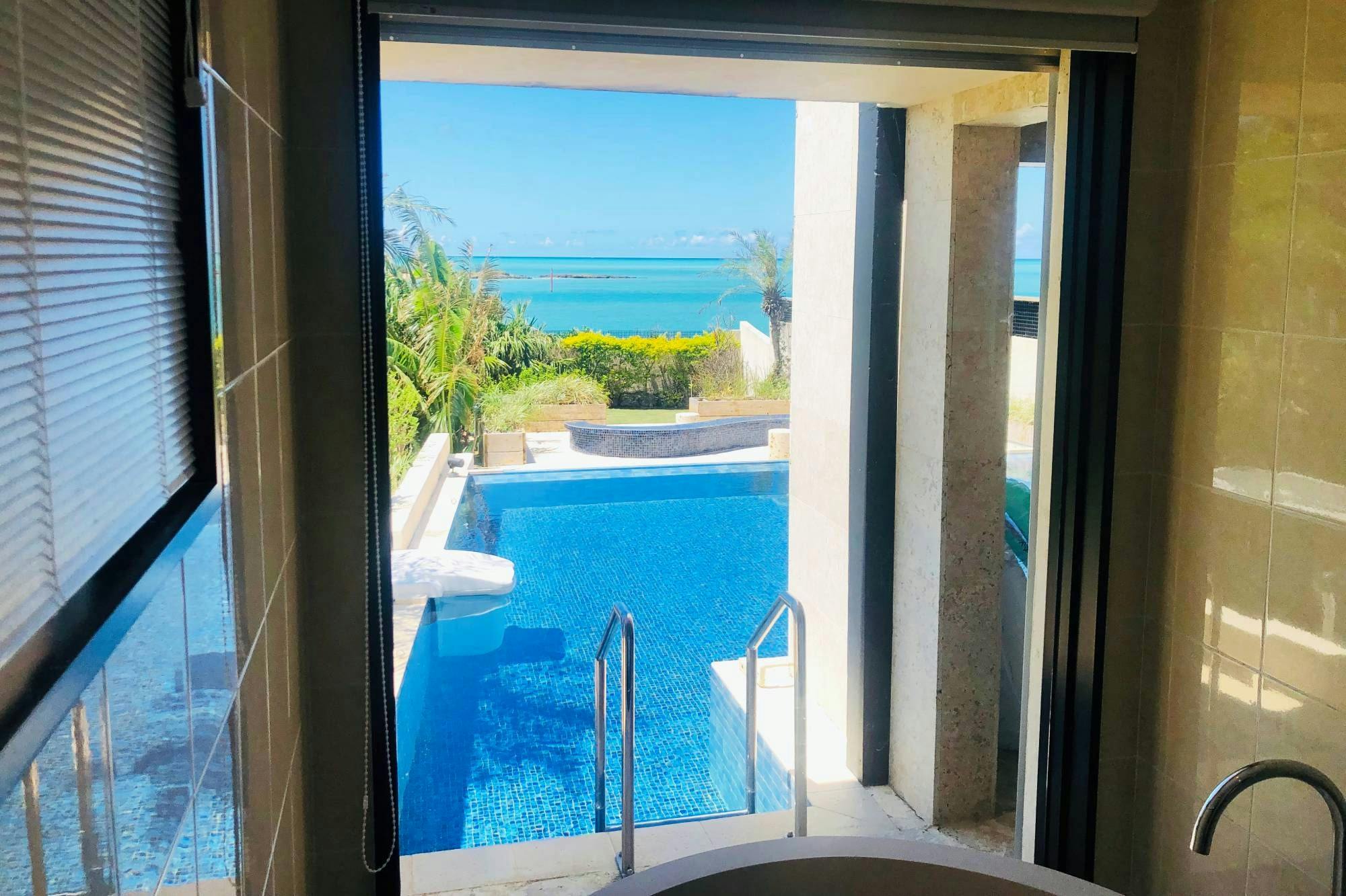 ユニの浜がヴィラから見えます。再訪ですが、前回は気付かず今回はツアーで上陸する人々が見えて、あぁあれがユニの浜だったんだ...とわかりました。海の色、キレイなわけだと納得したし、なんだか得した気分です。海岸でウェディング撮影してました。でも海岸からだと海抜が低いからか遠くのグラデーションまでは確認できず、ユニの浜も伊良部島の海岸かのように見えます。ヴィラから見た方が断然良いです。本当に一望出来るので写真より実際見たら感動が違うと思います。私は前浜より美しいと思いました。清潔感、設備面、プライベート感、ジャグジーに温水プール完璧。最高を再確認しました。
