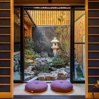 京都御所の南西に位置する「京恋 黄金屋」は、京町家をリノベーションした一棟貸切の宿です。 京都駅からタクシーで15分とアクセスも良く、周辺には二条城や、近年人気が高まっている御金神社などがあります。 厳選したアート作品や家具が並ぶ二階建ての館内には、快適なベッドはもちろん、長期滞在に嬉しいキッチンや洗濯乾燥機を完備しています。 お部屋の奥には鯉が泳ぐ中庭を望む岩風呂が印象的で、広々とした浴槽に身体を沈めれば旅の疲れはほぐされ、心からリラックスすることができます。 ラグジュアリーな空間で京都の伝統的な町家の雰囲気を味わいながら特別な時間をお過ごしください。
