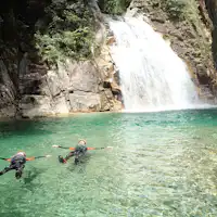 専属ガイドと一緒に、驚くほどの透明度の川の中を、歩いたり泳いだり、時には巨岩を乗り越えたりしながら、1キロ先にある絶景の滝を目指して大冒険。最後は、滝壺を貸し切りにして遊んでいただきます。
