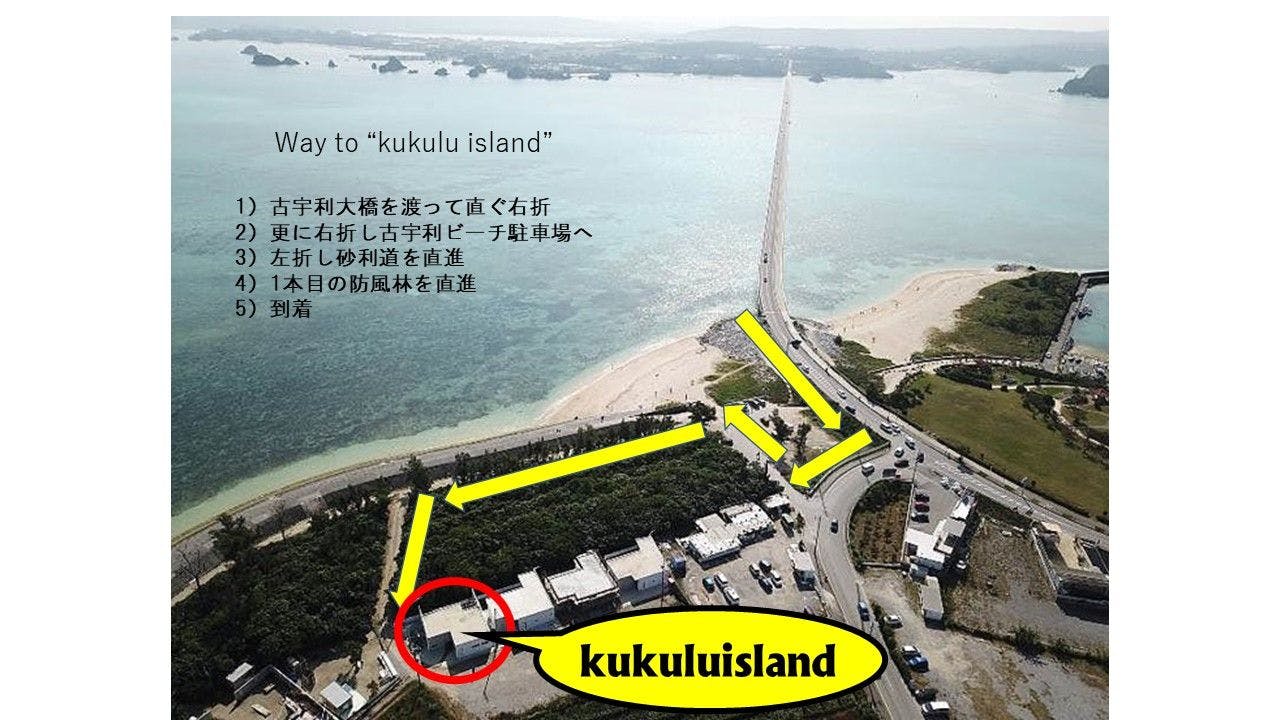 《お車でのアクセス》 【高速道路】 那覇空港より高速道路利用にて約1時間50分、 許田ICから国道58号線を北上し、 屋我地島を経由して古宇利島へ。古宇利大橋渡ってすぐ。 【一般道】 一般道利用にて約2時間10分です。 国道58号線を北上し、県道110号線交差点(ファミリーマートのある交差点)を左折し、 屋我地島(やがじしま)方面に向かいます。看板に従って進み、古宇利大橋を渡って古宇利島へ。 【公共交通機関】 1. 那覇空港より「やんばる急行バス(YKB888)」へ乗車し、「今帰仁村役場」で下車 2. 「やんばる急行バス四島線(YKB4T)」へ乗り継ぎ、「古宇利島物産センター」で下車 ※徒歩3分