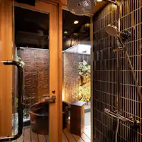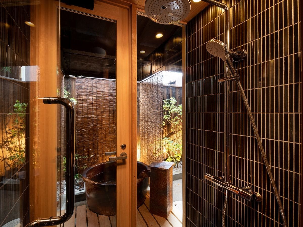 路地を抜けて玄関に入ると、昔ながらの土間と吹き抜け、おくどさんがお出迎えしてくれます。 ガラス張りの室内が解放感溢れる空間を演出し、1階の寝室からは奥庭を望むことができます。 螺旋状の階段を上がると、日本らしさを感じる畳の部屋とシーティングエリアで寛ぎの空間を演出します。 奥庭を眺めながら湯汲のできる露天風呂で至福のときをご堪能いただくことも可能です。 伝統的な趣の中でも快適に滞在いただける機能的な設備が充実しており、滞在の満足度をより高めてくれます。 また、街の中心地に位置しているので観光やショッピングなどにも最適です。 歴史ある京町家で充実した古都の旅をお楽しみ下さい。