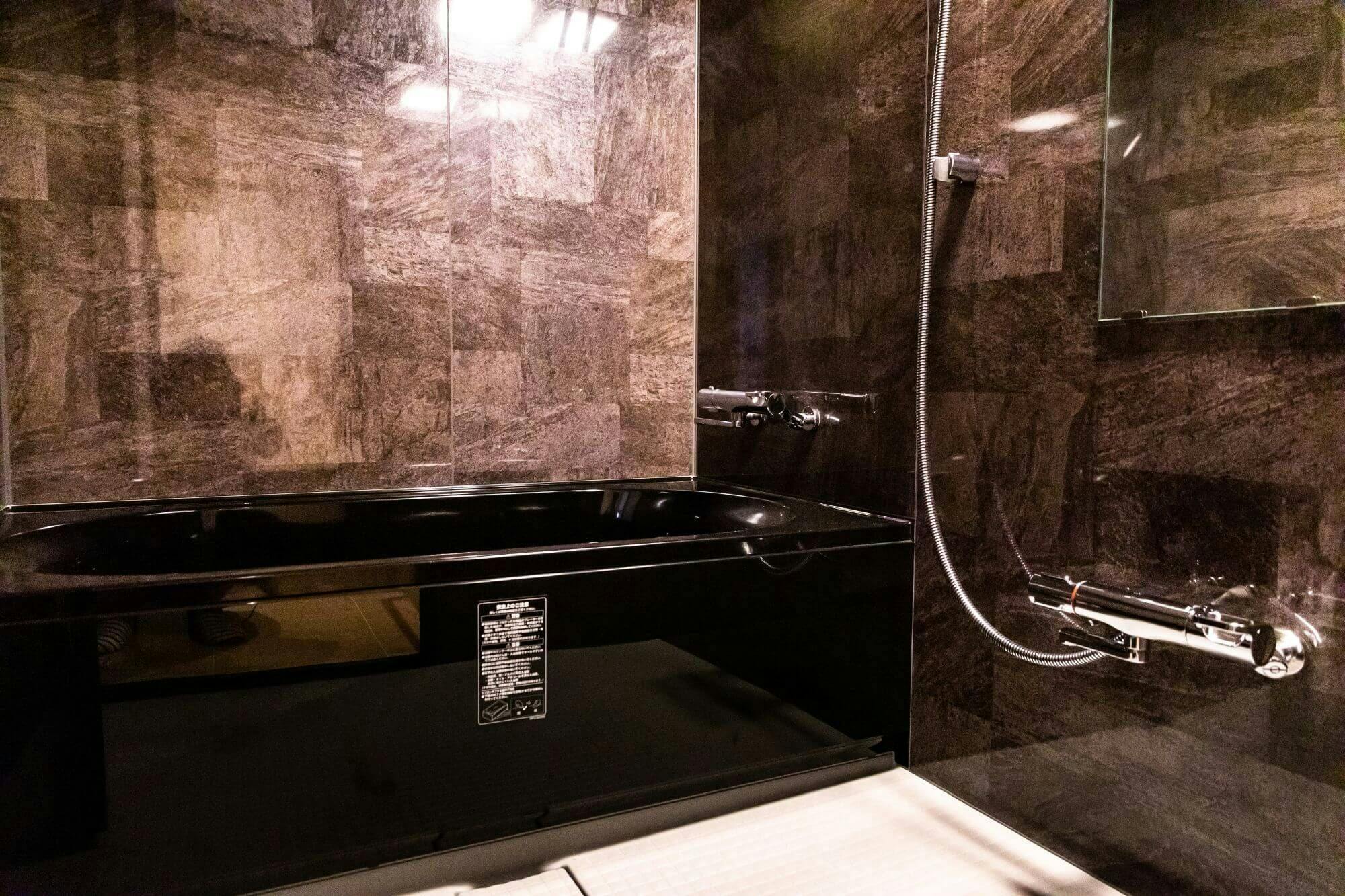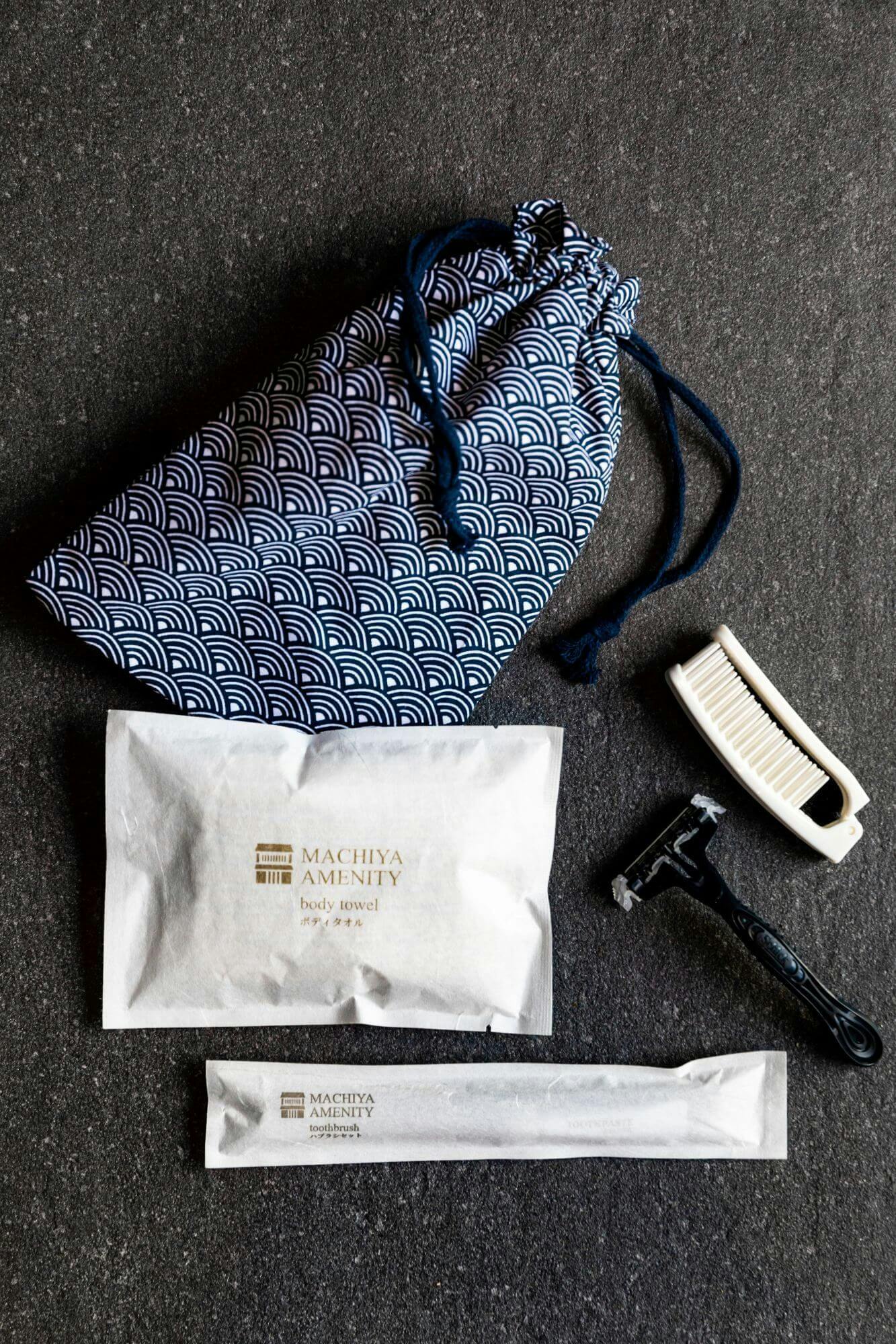 手ぶらでご宿泊いただけるよう、和柄の巾着入りの各種オリジナルバスアメニティを取り揃えており、手ぶらでご宿泊でも安心。浴室にはリラックスできるラベンダーと森林の香りのオリジナルシャンプー、コンディショナー、ボディソープも。