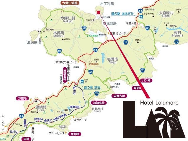 沖縄自動車道許田ICより車で約35分 台風等強風時、古宇利大橋が通行止めになる場合があります。通行状況はホテルまでお問い合わせください。
