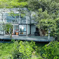 前面・側面ガラス張りのモダニズム建築。大自然の中で非日常世界を満喫