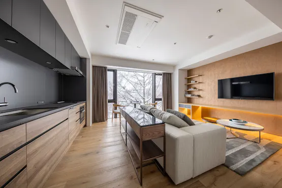 徒歩圏内にはコンビニエンスストアや飲食店、静かな森にも囲まれ、利便性も大自然との調和も妥協しない、ニセコひらふ地区のいいとこ取りのスタイリッシュなコンドミニアムホテルです。アパートメントタイプの客室で、靴を脱いでご自宅のようにお過ごしいただけます。客室にはスマートテレビ、コーヒーマシン、エアコン、空気清浄機、無料wi-fiの他に、客室によってはキッチン、調理器具、食器、カトラリーを備え、週末利用のショートステイだけでなく、夏は避暑メインでのご滞在や、ワーケーション、お子様のサマーキャンプ、ゴルフなどニセコでのお試し長期ステイにも最適です。館内に共用温泉施設、レストランを備えております。