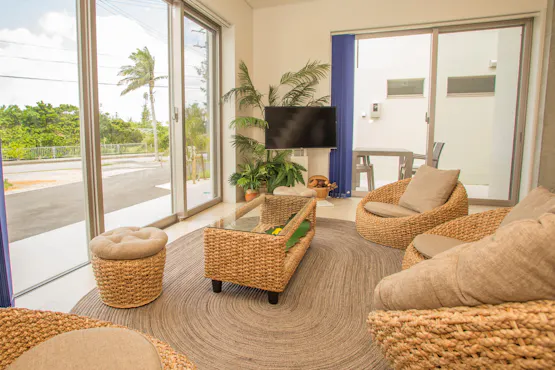 「1日1組限定」のプライベートヴィラです。ヴィラは、2階建ての2LDK(120㎡)で駐車場1台完備してございます(敷地内) 沖縄でも人気の観光スポットの「青の洞窟」まで車で6分で行くことができます。 ヴィラから徒歩5分のところには隠れ家ビーチ(宇加地ビーチ)もあります。 人は少ないですが、海の透明度はとっても高くてすごく綺麗なのでおすすめです。 ヴィラには2階にバルコニーで日光浴ができるようにビーチベッドを置いてますので是非ご利用ください! 暖かい空気は感じたいけど直射日光は避けたいなぁという方は、1階の屋根付きテラスでお過ごしいただけます。 テラスではBBQ(雨天でも)もできますし、ハンモックに寝そべりながら心地よい風にあたるのはとても気持ちがいいです。 室内にはchromecastを設置してますので、夜は大画面のテレビで映画を見たり、 お昼間はお子さん向けの動画などをNetflixやAmazonPrimeのアプリから見ることができます。 ご旅行の方はもちろん、島にプチ移住や別荘をご検討中の方にも住むように滞在することができる空間づくりを心がけています。 海外ビーチリゾートとは一味違う沖縄の素敵な島時間をお過ごしください。 ※BBQについてはご予約の際にお問い合わせお願いいたします。
