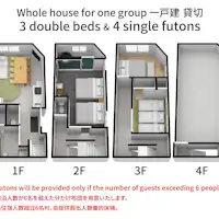以下のような設備や特徴があります。 一棟貸切・洗濯機あり・寝室複数・近隣スーパーあり・駅まで徒歩圏内・食料品の持込可