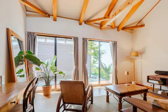 ATTA HOTEL INAMURAは、鎌倉稲村ガ崎の山の上にある、すばらしい景色のリゾート住宅です。多くの方に鎌倉の魅力をもっと知って欲しいと思い、自宅の離れを1日1組限定のバケーションレンタル(貸別荘)にしました。 室内にはインドネシアで20年前に買い付けたビンテージ家具を配置し、インテリアデザイナーである夫と私の2人で室内のコーディネートをしています。 お泊り頂く離れのゲストルームはホストの住まいに隣接していますが、共用部分であるランドリールームを除き、完全にプライベートは確保されています。チェックインの対応などは全てホストが直接行いますので、心のこもった温かいおもてなしで皆様をお迎えします。 徒歩圏内には色々なレストランやカフェがあり、江ノ電やレンタル自転車を利用して鎌倉市内や江ノ島への観光も楽しめます。 ホテルへは階段を登らなければ辿り着けず、決して便利な場所ではありません。「波の音を聞きながら眠りにつき、鳥のさえずりで目覚める」 そんな立地だからこそ叶う自然に囲まれた贅沢な時間をお過ごし下さい。