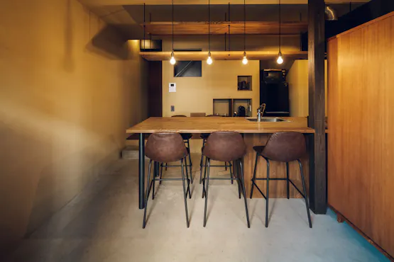 歴史を感じさせる町家建築の中には外からは想像できない多層構造の空間が広がります。 元々防空壕だった半地下の層にはじまり、土間、庭に面した居間、一階、中二階、二階がシームレスにつながっていく。 訪れた方は、各層の思い思いの場所でくつろぎ、自分らしい時間を過ごすことができます。