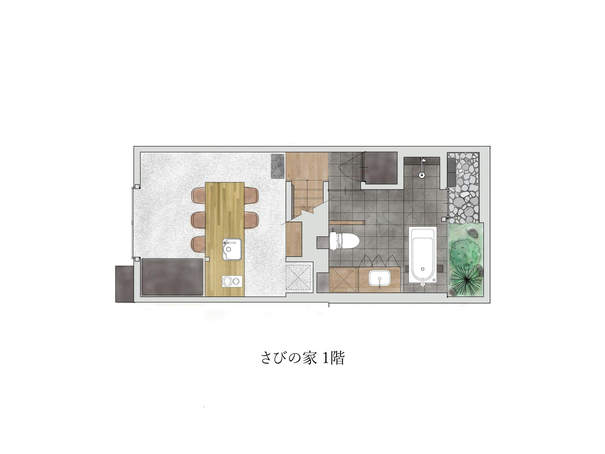 各部屋が多面的な顔を持つ、立体構造がイエノ家の特徴です。 家に入ってすぐのリビングは、通りに面した扉を開けるとオープンテラスの顔に。 土間から眺める坪庭も、据えられたソファに座れば露天風呂スペースの一部へと変わっていく。 二階寝室の窓を開けると、隣の部屋がまるで違う家のよう。 内と外が溶け合ったこの空間を、どのように愉しむかはあなた次第です。