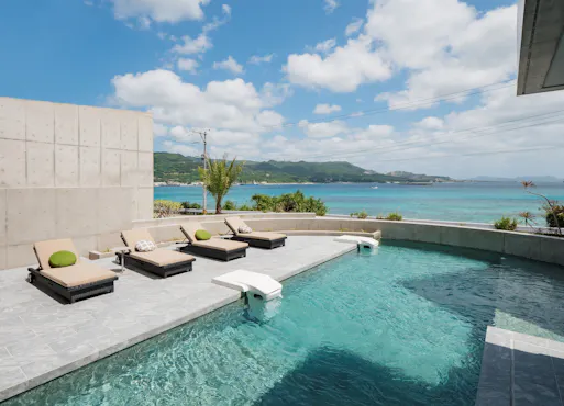 オーシャンフロントのプライベートヴィラには貸切のプールがございます お子様向けの水深40cmのエリアと、大人向けの水深120cmのエリア がございます。リビングの目の前だから安心してお子様を見守ることができます。 浮き輪などは無料で貸し出しさせていただいております。