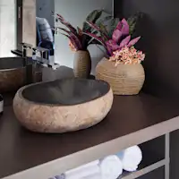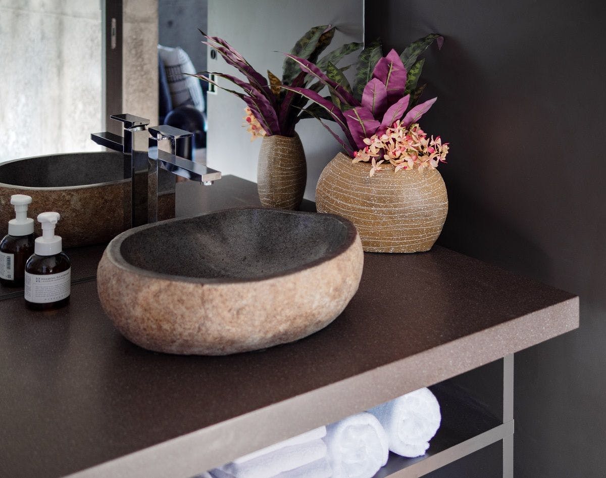 岩を丸ごとくり抜いた大きめのバスタブ。 フラワーバスプランで、 薔薇の花びらを浮かべて至極の時間を楽しんで。