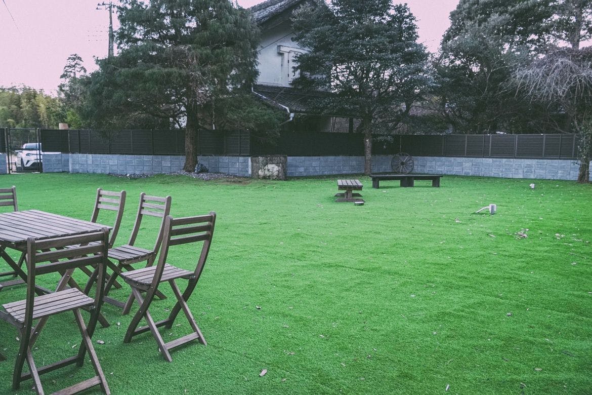 杉木立が美しい山々と田園風景が広がる杉之家。 お部屋から見渡せる広々した専用ドッグランは、広さ約300平米。 ドッグランでは、わんちゃんが遊ぶ様子を見ながらBBQや焚き火をお楽しみいただけます。 築120年の木の自然な香りにほっとする居間から、土間や寝室、庭が見渡せるレイアウトで、わんちゃんもご家族も安心して過ごしていただけます。