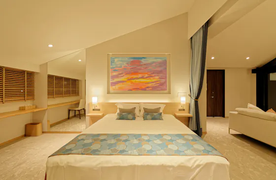 ゲストルーム・ハネムーンスイートは、屋外ジャグジーやサウナを備え、癒しの時間をもたらしてくれます。彰往考来とはこれまでを想い、これからを考えるという2代藩主光圀公の大事にした言葉。プライベートやビジネスの大切な時間、ご自身に向き合って思いを巡らせるこのとのできる、贅沢な空間をつくりました。