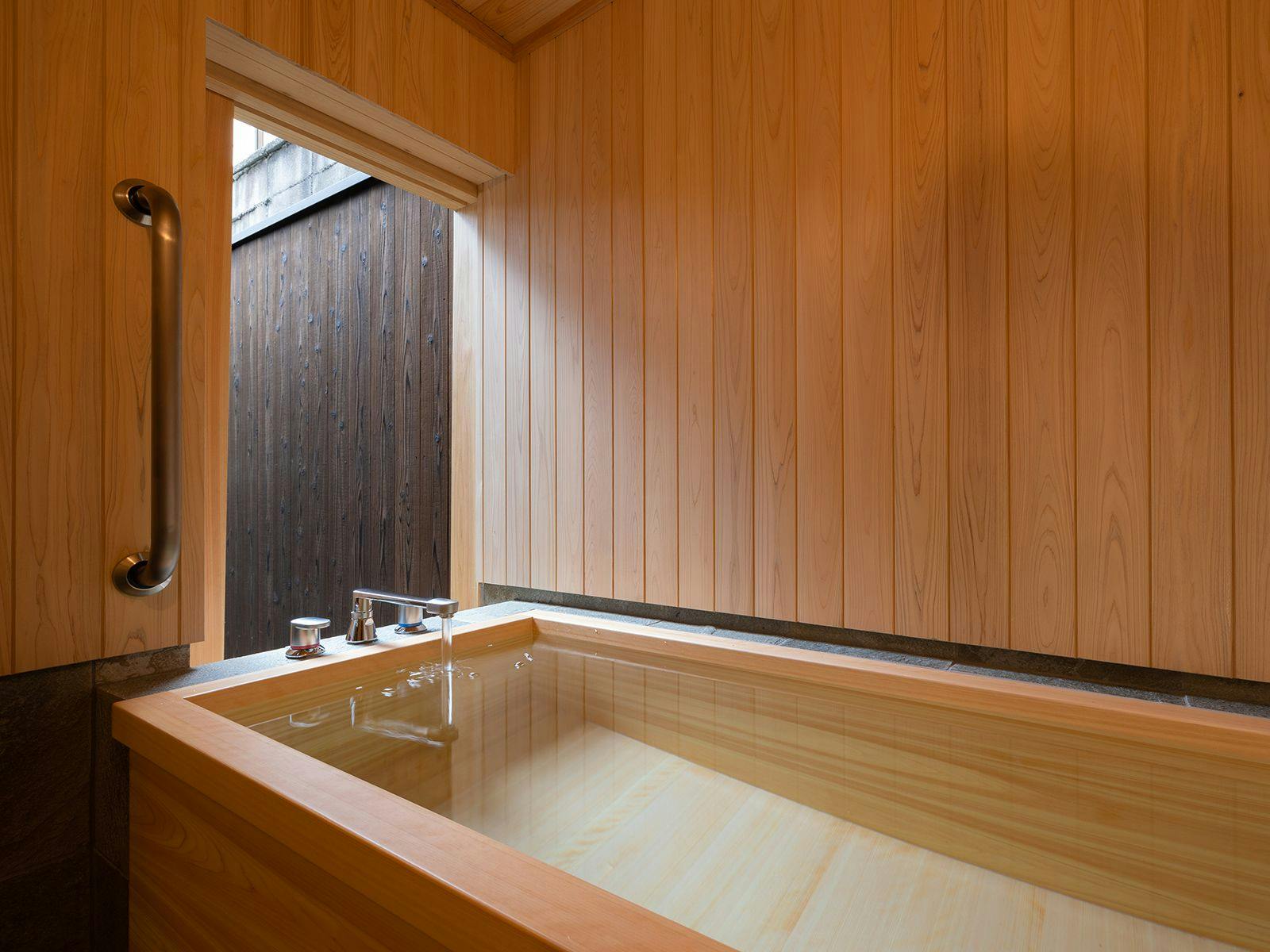 檜浴槽で庭を見ながら湯浴みを愉しむペットと泊まれる一棟貸しの京町屋