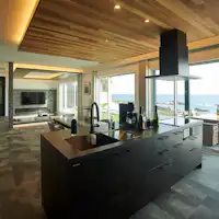 お料理するときも食事のときもワンちゃんと一緒に過ごせるのも特徴のひとつ。火を使うバーベキューの際も危険が及ぶことのないよう、ダイニングテープルの中央に七輪を内蔵することで、大切なワンちゃんの安全を確保しています。