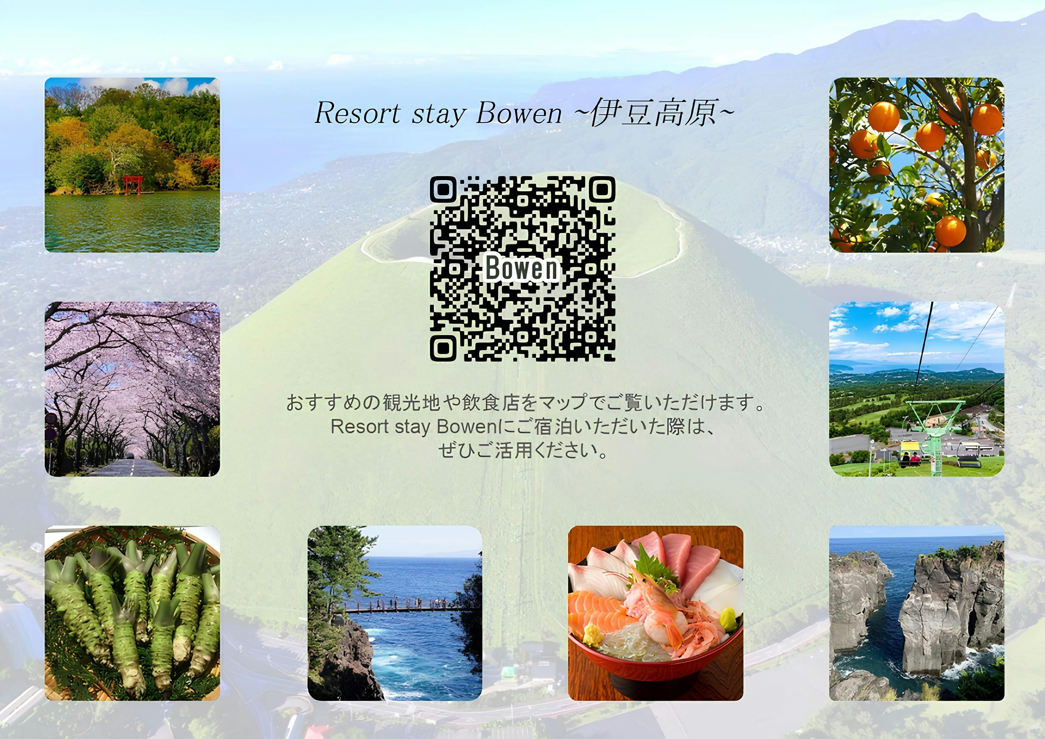 高級別荘地「伊豆高原」に位置する「Resort stay BOWEN “伊豆高原”」 1000平米以上の広大な敷地を有するBOWENは、ご家族や大切な人と一緒にプライベートかつラグジュアリーな休日をお過ごしいただくのに最適。 お庭からは壮大な大室山を眺め、お部屋からは太平洋を眺めることが出来る伊豆高原でも数少ない施設のひとつ。 時間の経過とともに移ろう景色を眺め、美しく澄んだ空気で心と体を浄化すれば、かけがえのない休日となることでしょう。 皆様の想い出づくりの一助になれば幸いです。