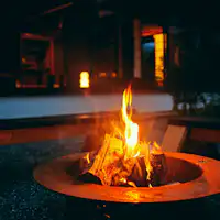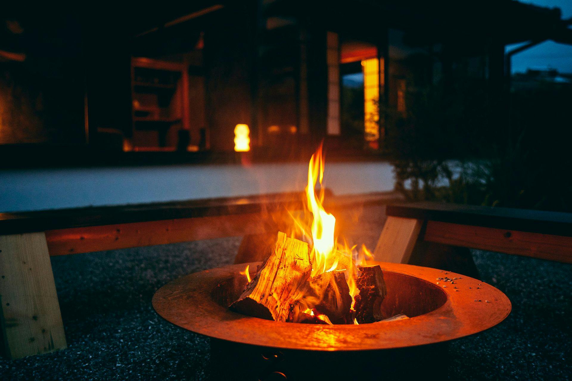食後のひとときは揺れる炎を前にリラックスタイム。里山の静かな夜を大切な人とお過ごしください。