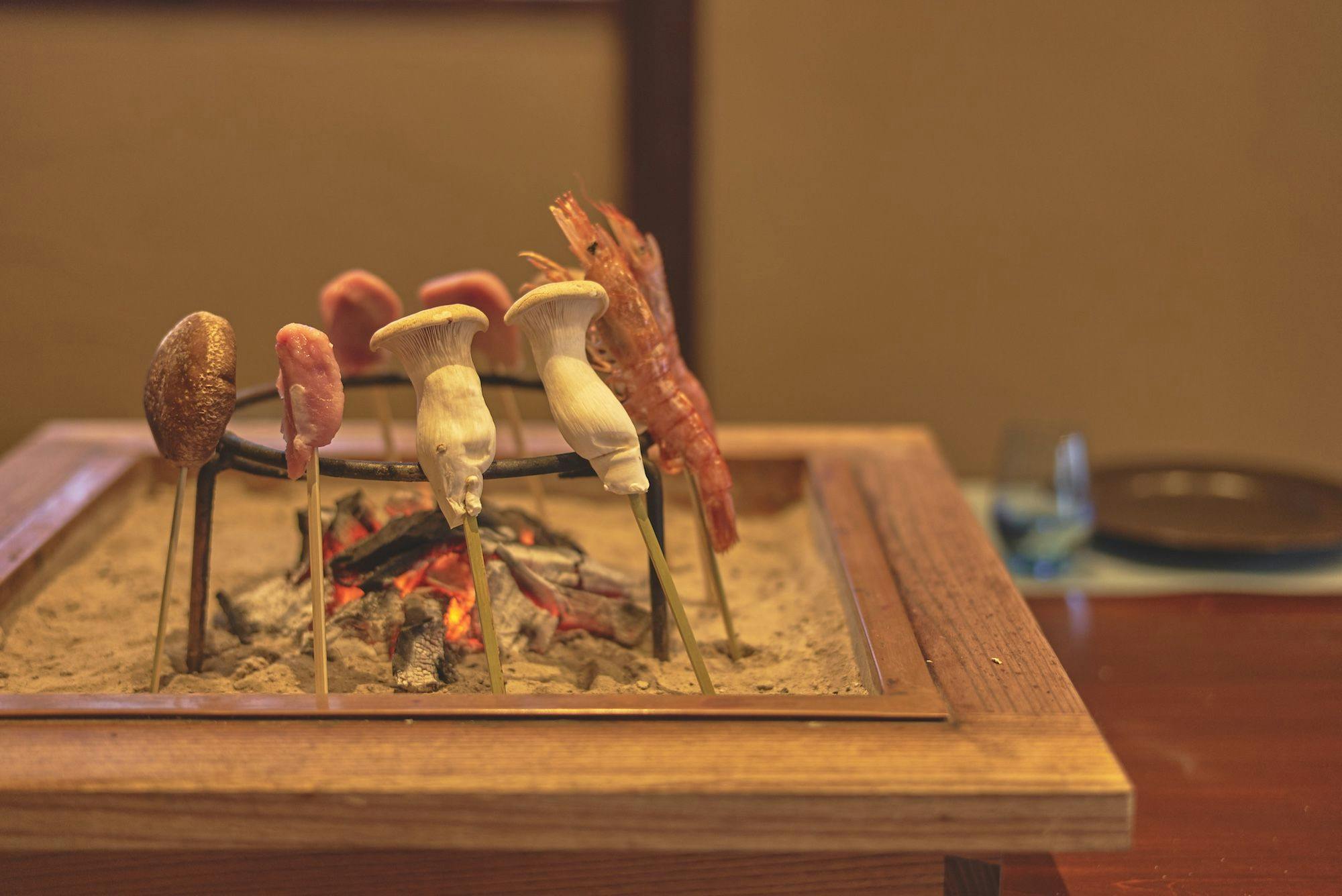 ダイニングでは、囲炉裏を囲んでお食事を。 旬の食材を使った串焼きをお楽しみいただけます。