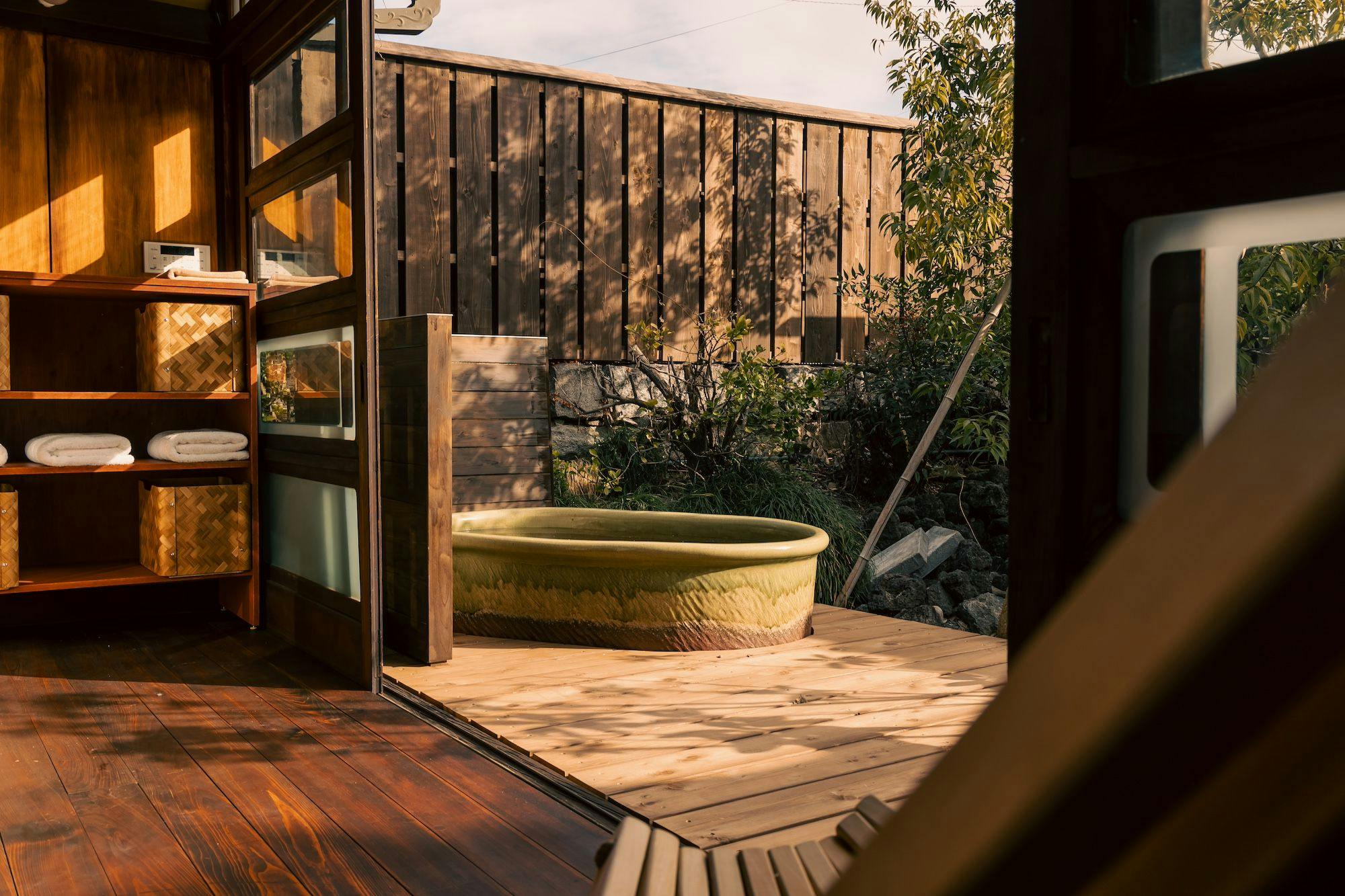 中庭を眺めながら浸かれる露天風呂。 朝の新鮮な空気や夜の星空の下で、贅沢なひとときをお過ごしいただけます。
