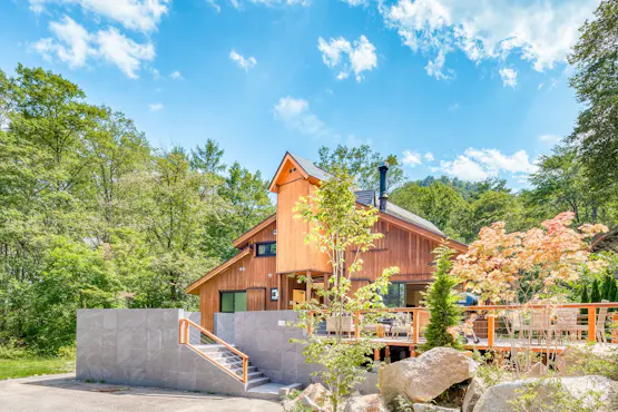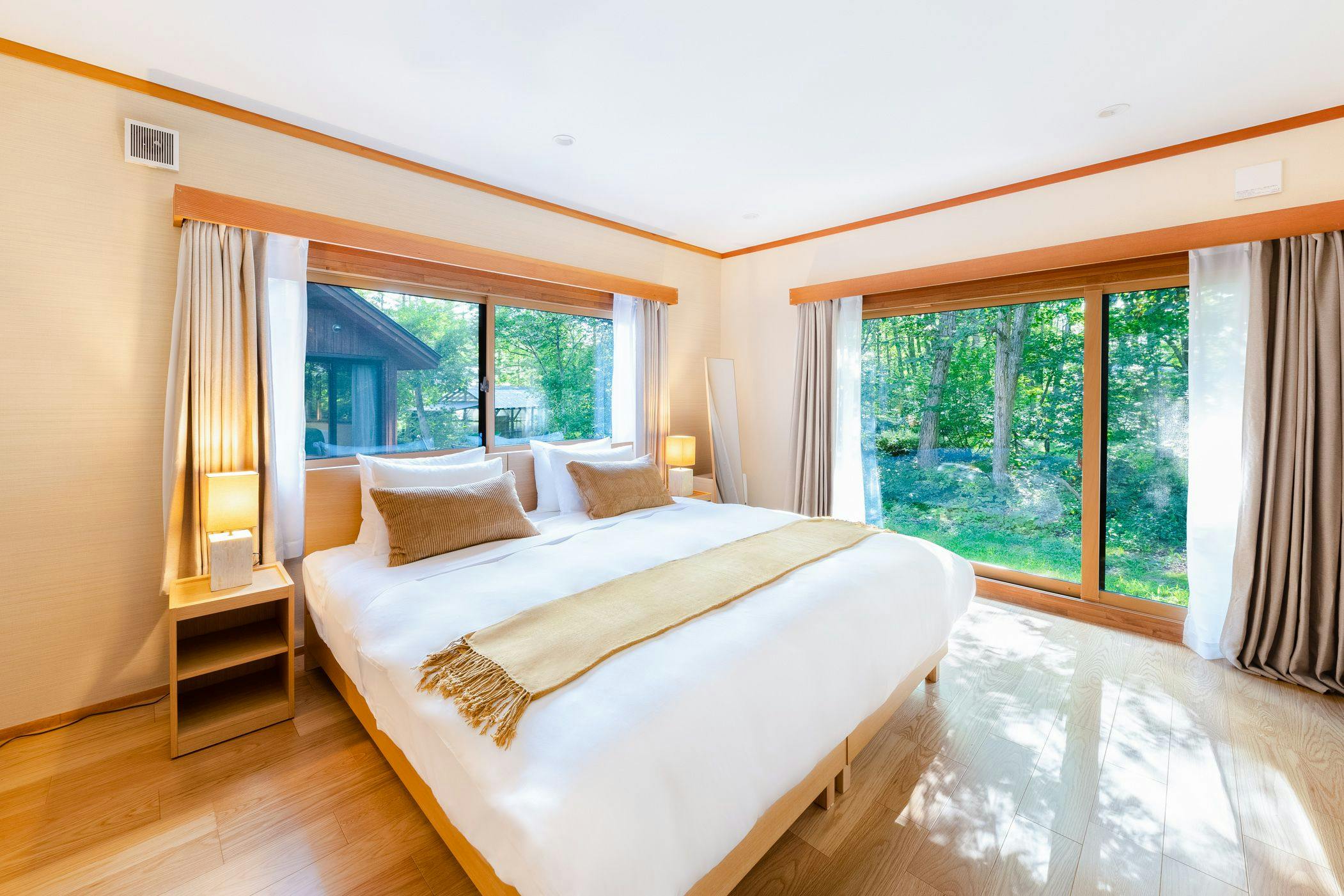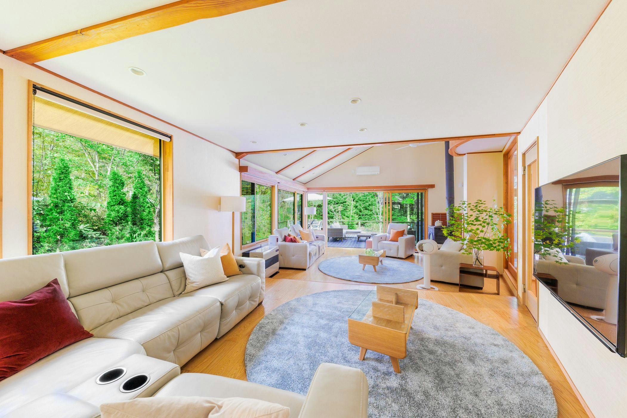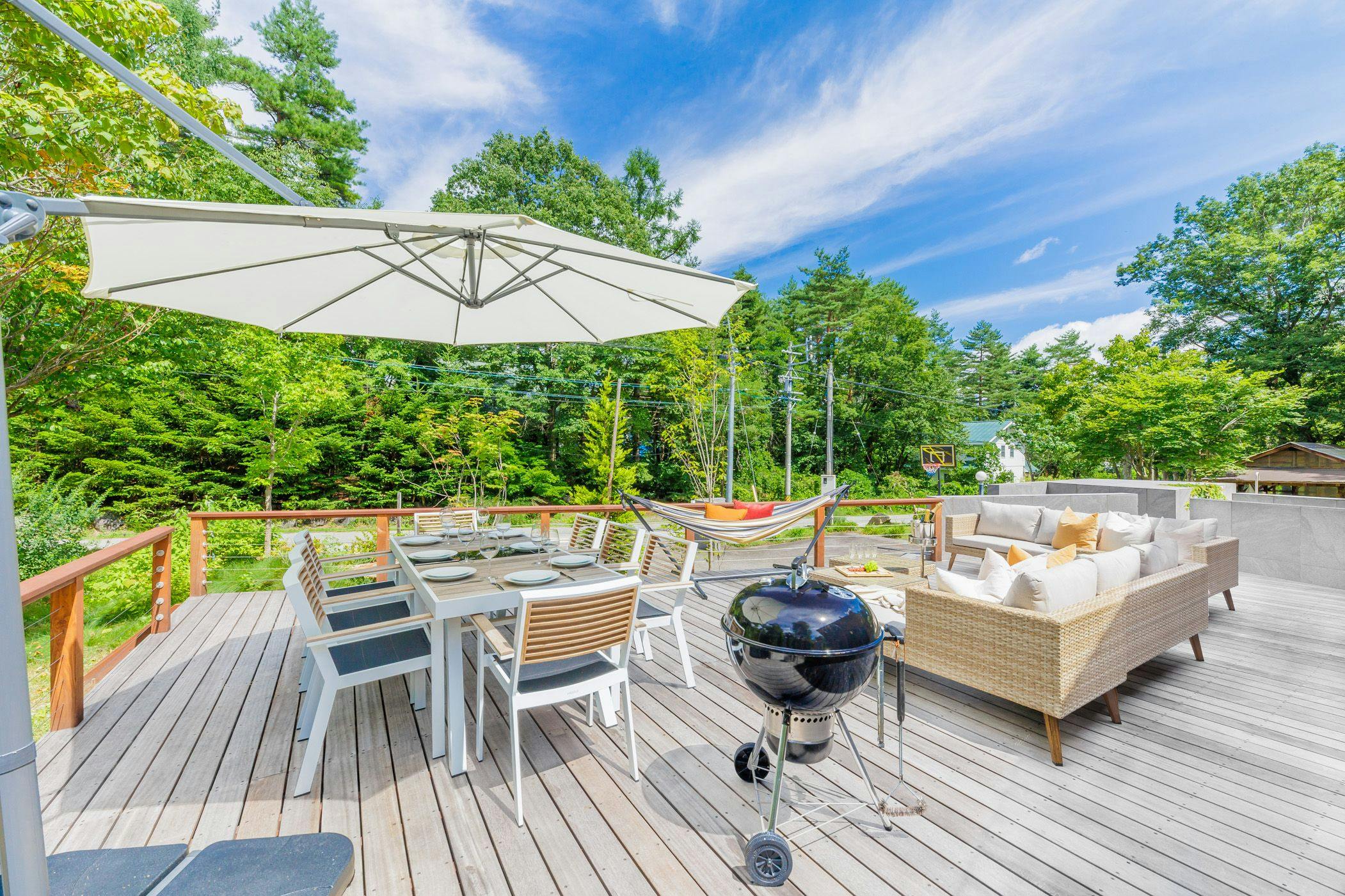 白馬の山々を望む800坪の敷地に立つ貸別荘で、自然に囲まれた寛ぎの滞在を