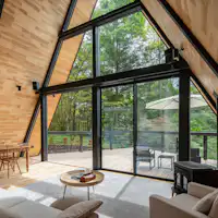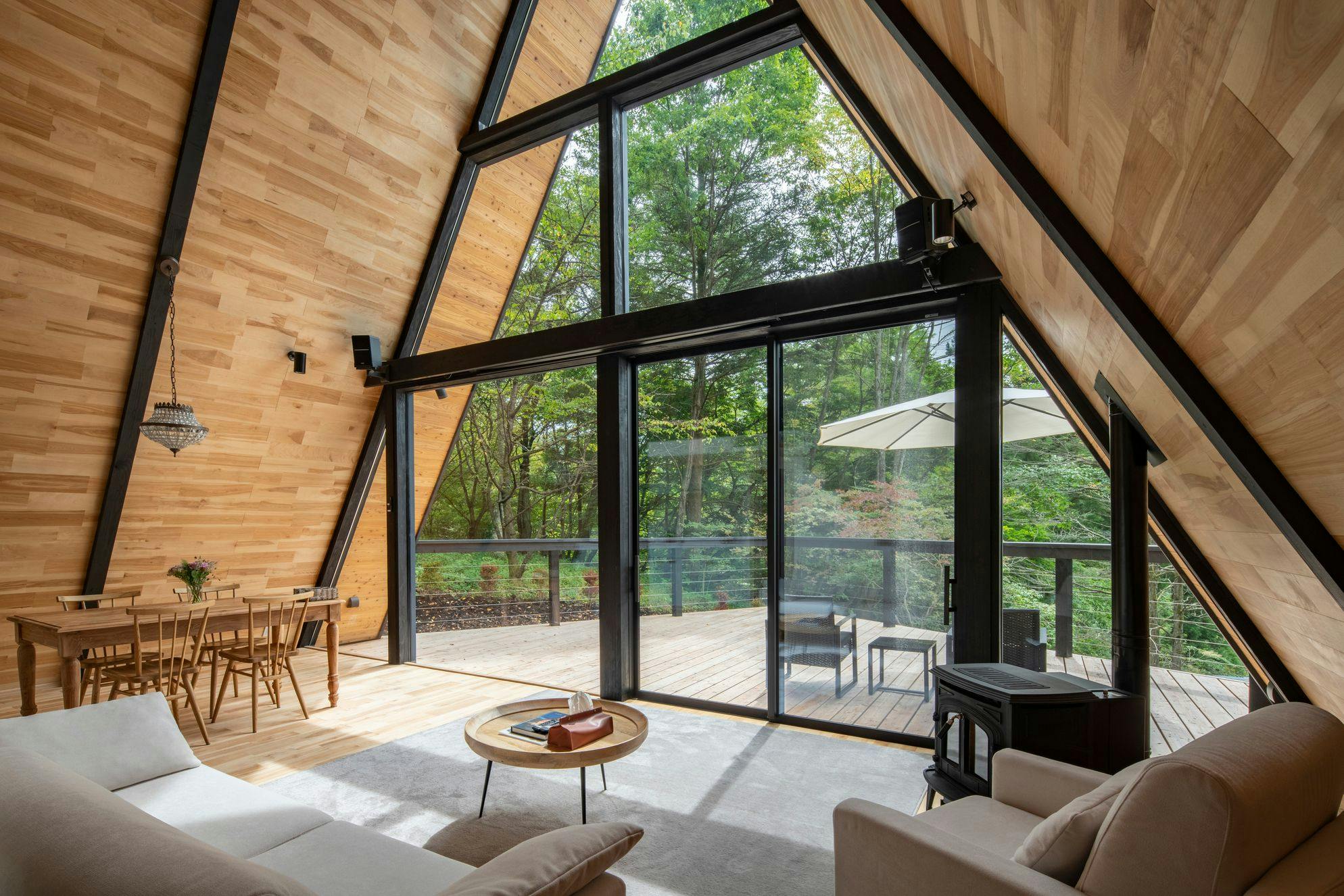 A-Frame Houseとはその名の通りアルファベットのAの形をした家です。大自然の中にAの形の大開口と大空間を取り入れ、普通の家ではない高さ8Mの建物の中で自然との繋がりを強く実感できる宿泊施設です。日本の自然と文化に触れながら海外にいるような雰囲気もお楽しみください。大開口窓からは自然を見るだけでなく、人が自然の中に存在する空間を実感していただけます。当施設の魅力とは、個性的なお部屋の中で時間に縛られずに家で暮らす快適さを得られ、スーパーに行ってお料理をしたり、お散歩したりと、地元の人の視線で旅先を経験できるという点です。軽井沢に暮らしてみるという感覚と軽井沢の美しさをお楽しみください。