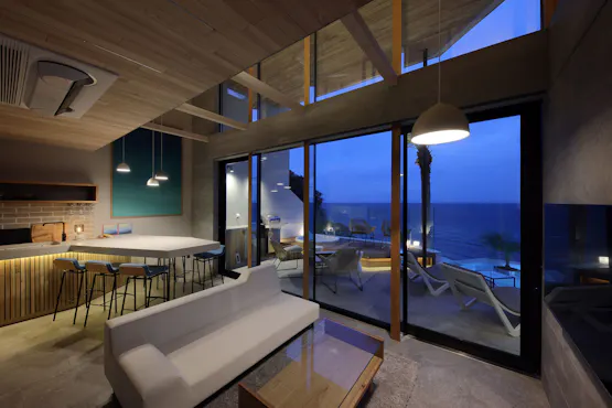淡路島西海岸の海は、昼間はエメラルドグリーンに輝き、朝焼けや夕焼けを楽しめるオーシャンビュースポットが多数あります。 KONA RESORT AWAJI KAIは、その海を存分に楽しむために創られた貸別荘となっております。 淡路の海に沈む夕日を楽しめるインフィニティ・プール、オーシャンビューのサウナとジャグジー、BBQを楽しめる広いテラスを備えたペット対応の1棟貸の貸別荘リゾートです。 オーシャンビューと建築デザイナーが作り出す非日常空間を満喫してください。